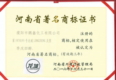 我公司“龍城”季戊四醇于2013年12月首次獲得河南省著名商標,近幾年經(jīng)過公司研發(fā)技改,產(chǎn)品質(zhì)量和市場占有率進一步提高,于2016年12月順利延續(xù)“河南省著名商標”榮譽稱號!